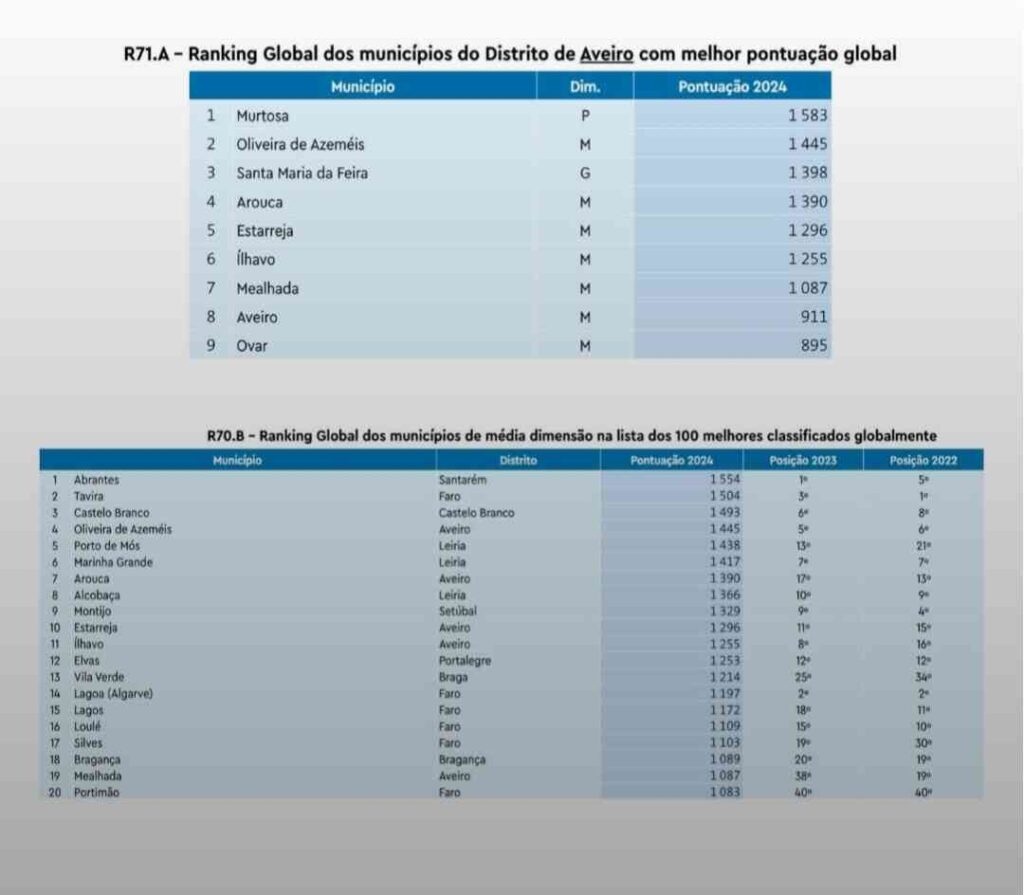 Nos de pequena dimensão, Óbidos é o mais eficiente, com 1.606 pontos, seguido da Murtosa (1.583) e de Santa Cruz das Flores, nos Açores (1.573). No ranking do distrito aveirense, Estarreja (1.296) ficou em quinto lugar e Ovar (895) em nono.